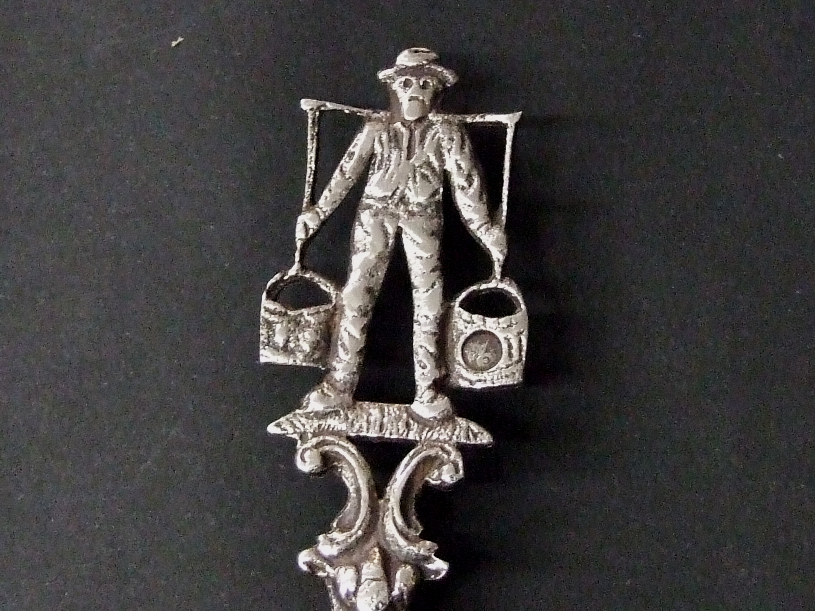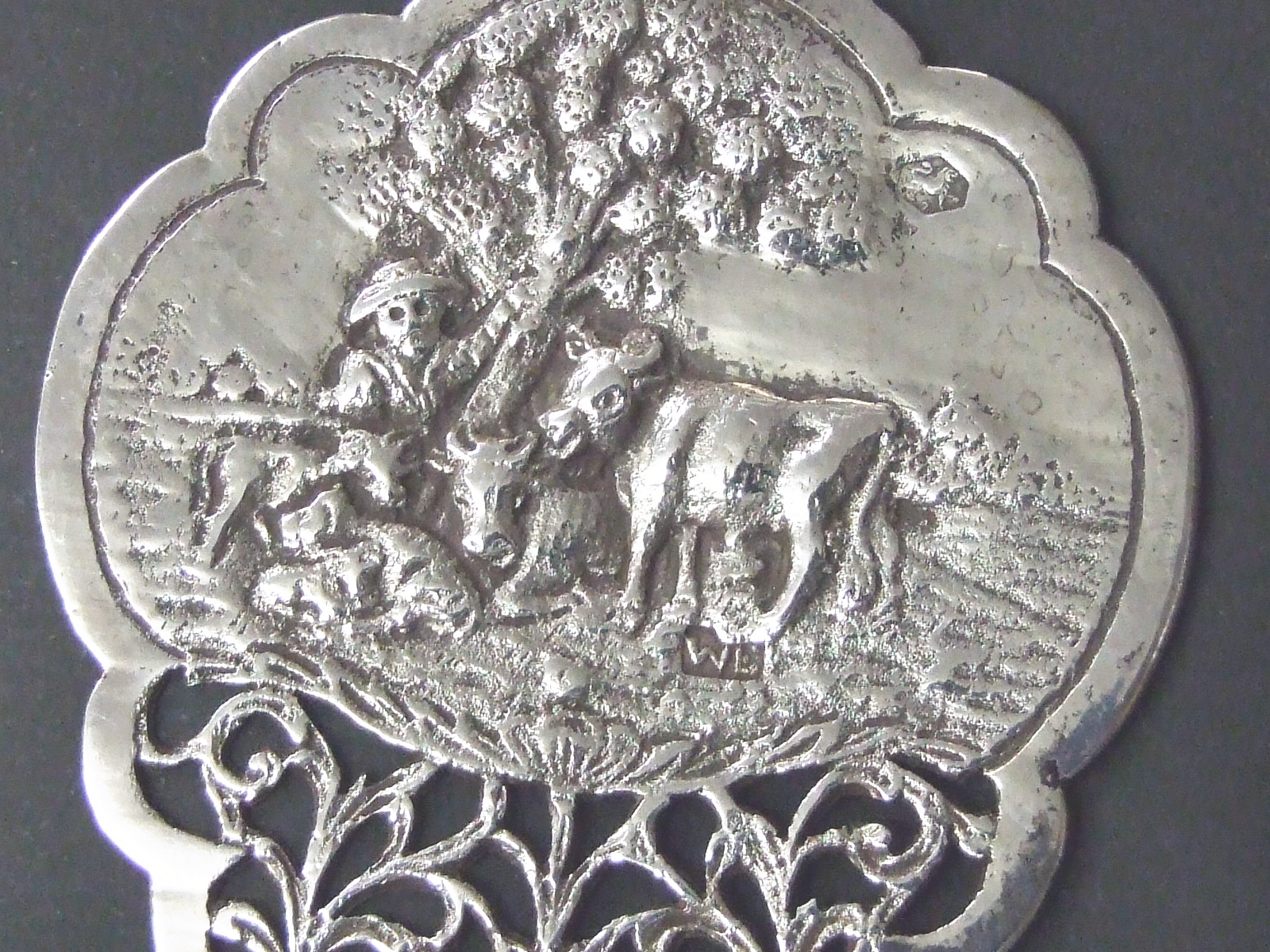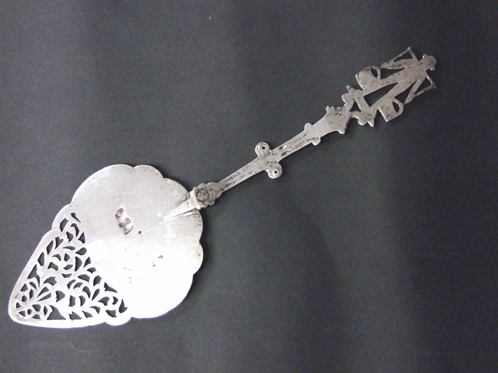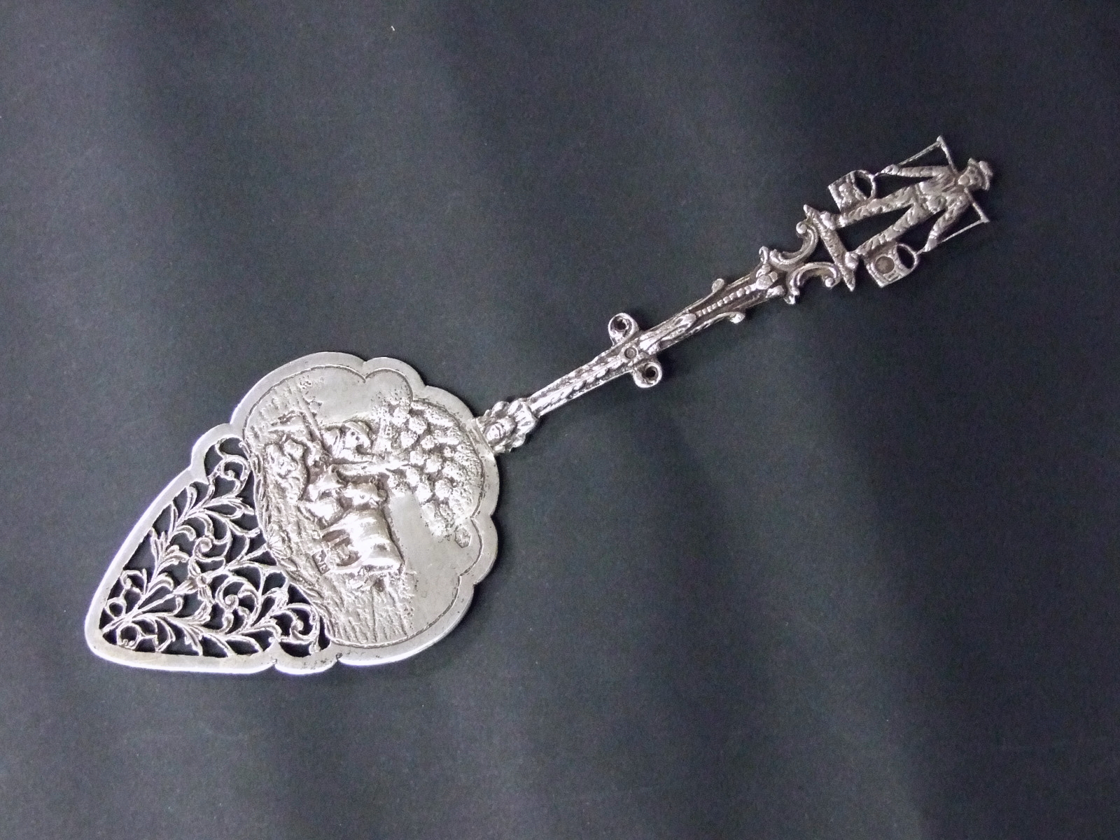 | 1924年、オランダの銀の刻印が入ったケーキサーバー 幅6cm、長さ18.7cm、重さ 41g 、銀の純度 835/1000 リンゴの木の下で女の人と牛2頭と仔牛1頭の図柄、唐草模様 リンゴの木の横にオランダ銀を証明するライオンマークが入っています 柄の部分はミルク運びの男の人 帽子をかぶって、ミルク桶を肩に載せてバランスを取っている ミルク桶にハーグで銀の税金を納めた刻印 柄の中ほどに銀を証明した年代の刻印が入っています テーブルでケーキを取り分ける時、食事の取り分けなどに便利です 状態良し、オランダのフォークアートのデザイン |