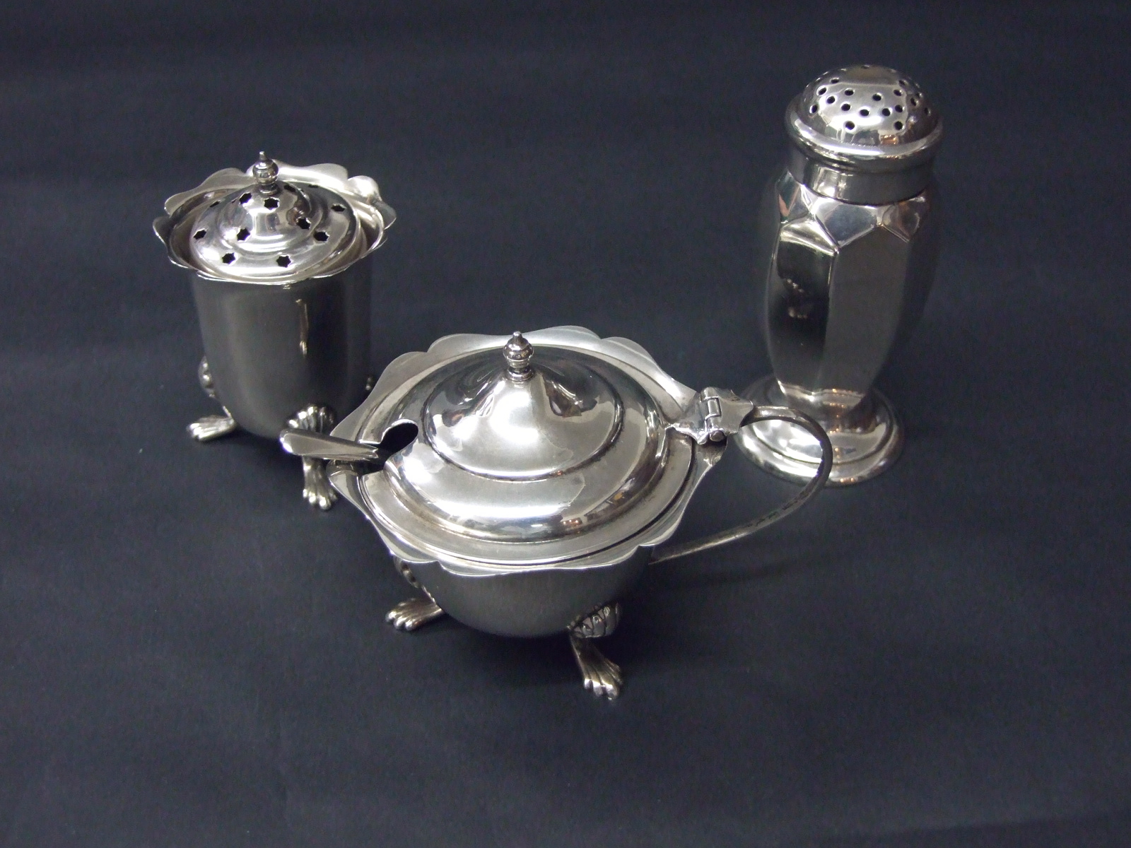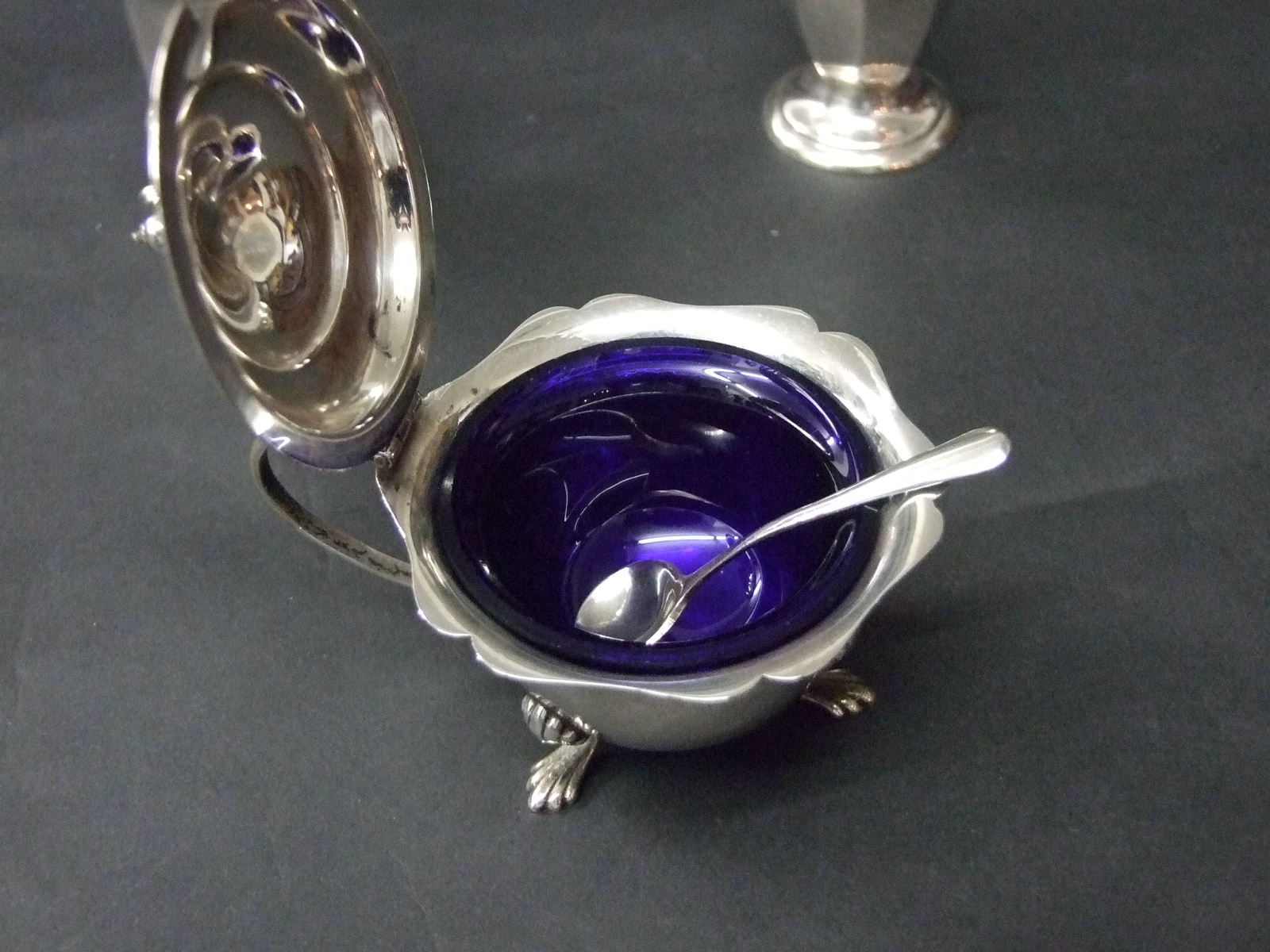 辛子容器は動物の足、中に青いガラス、小さな銀のスプーン